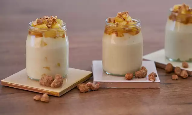 Trascorse le ore di fermentazione, riponi in frigorifero per alcune ore la crema di yogurt, e prima di servire accompagna con le mele caramellate.